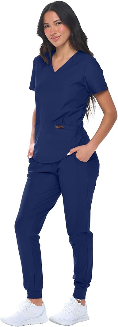 - CUTTING EDGE STRETCH FABRIC- Add a whole new dimension of comfort to your work wardrobe. This jogger scrub set is made from premium quality nylon-spandex blend fabric to flatter your curves and stretch every way you need to. You have to stretch it to believe it!