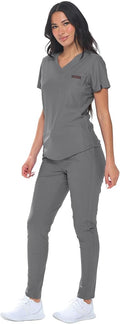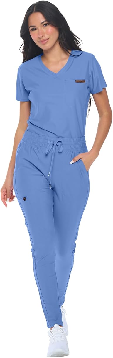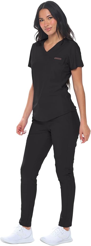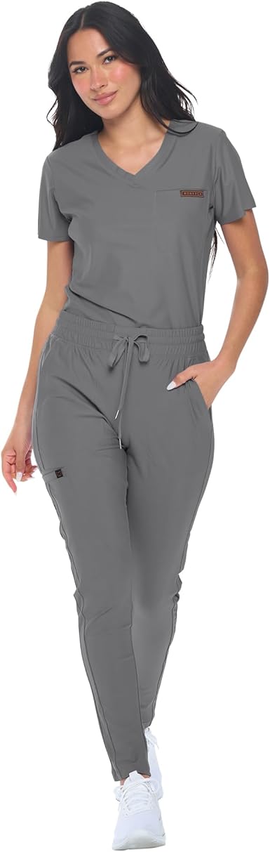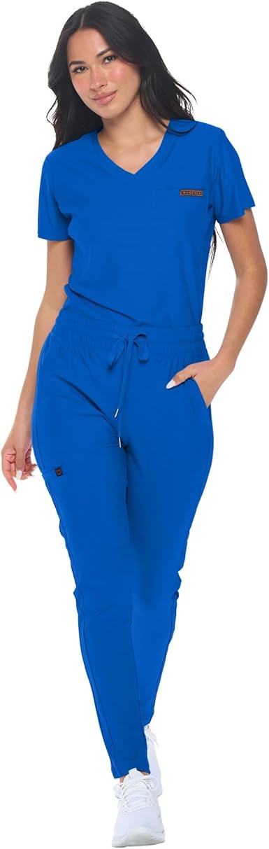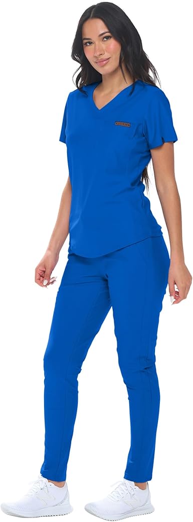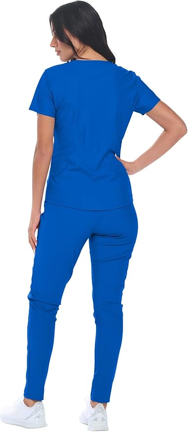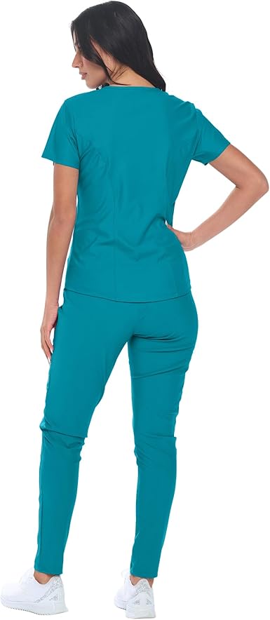 - CUTTING EDGE STRETCH FABRIC- Add a whole new dimension of comfort to your work wardrobe. This scrub set is made from premium quality nylon-spandex blend fabric to flatter your curves and stretch every way you need to. You have to stretch it to believe it!
